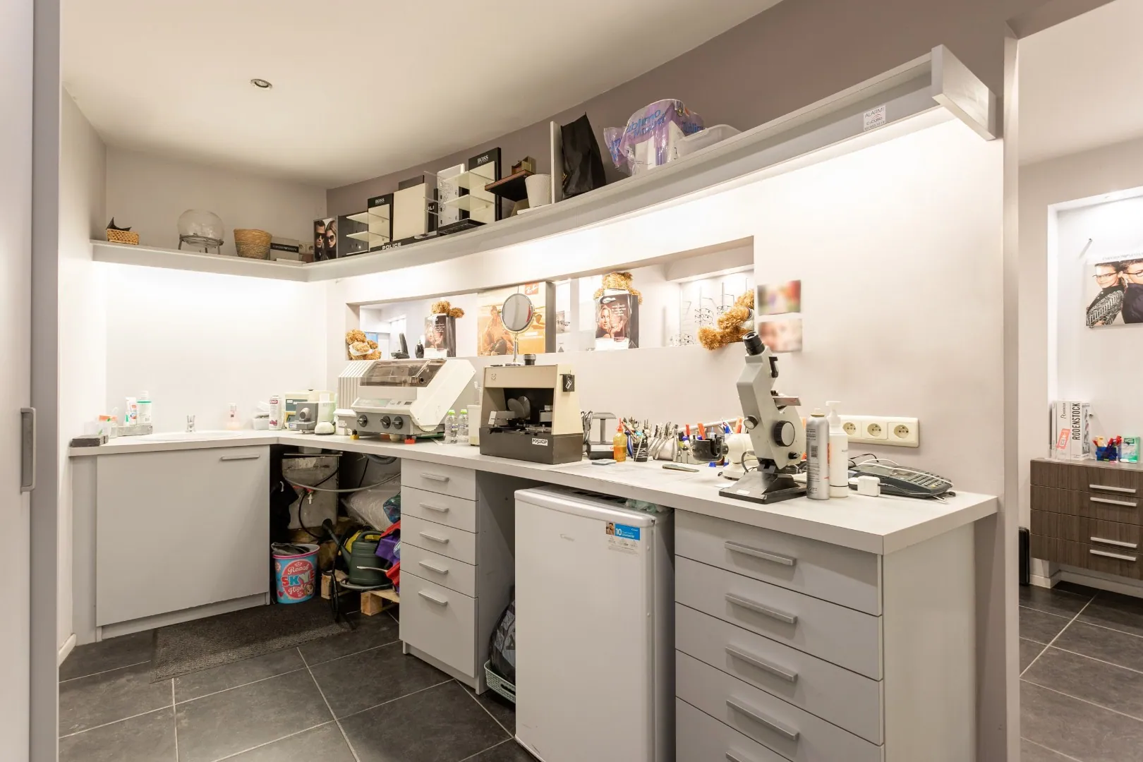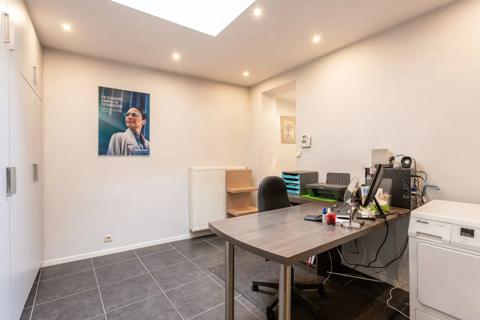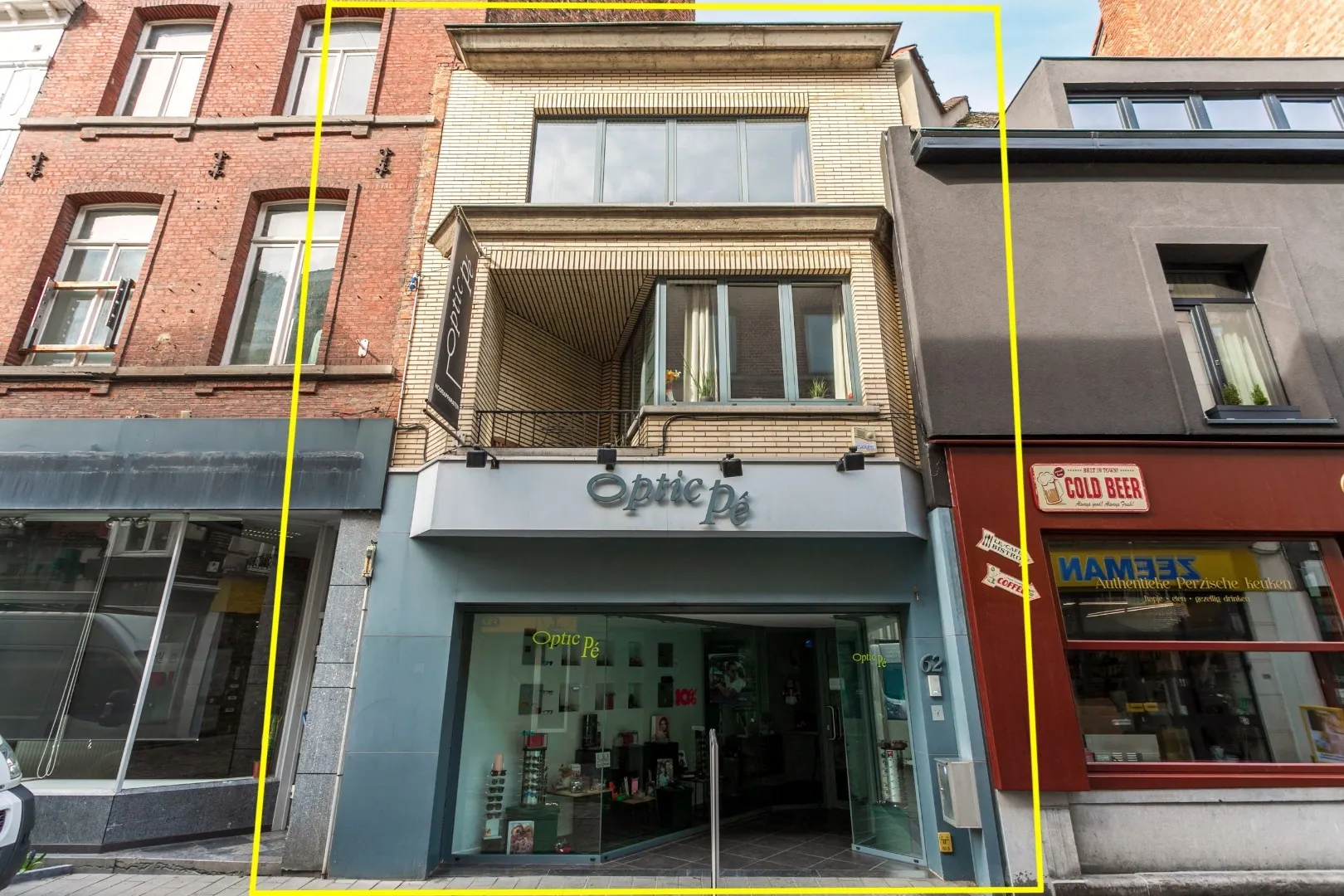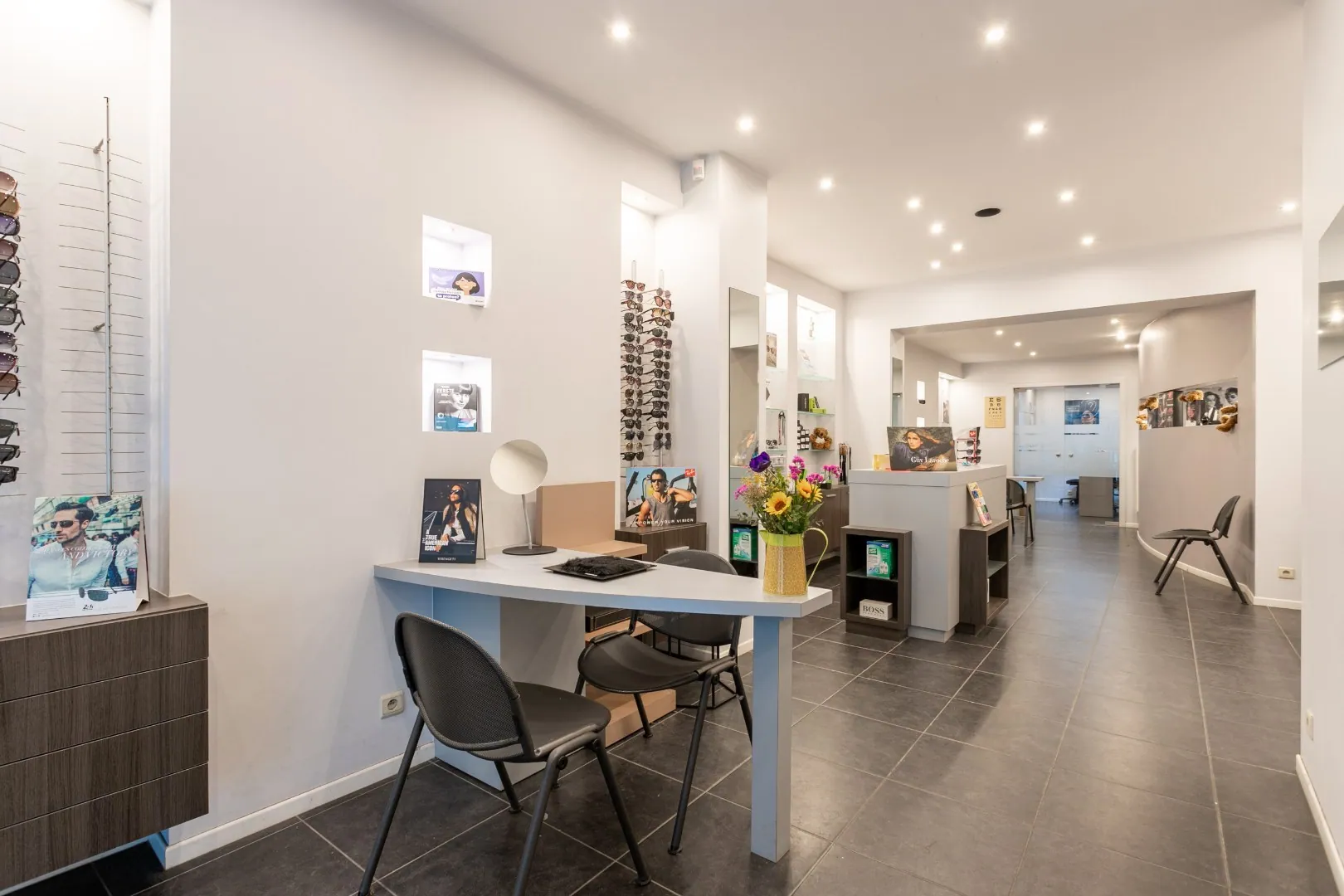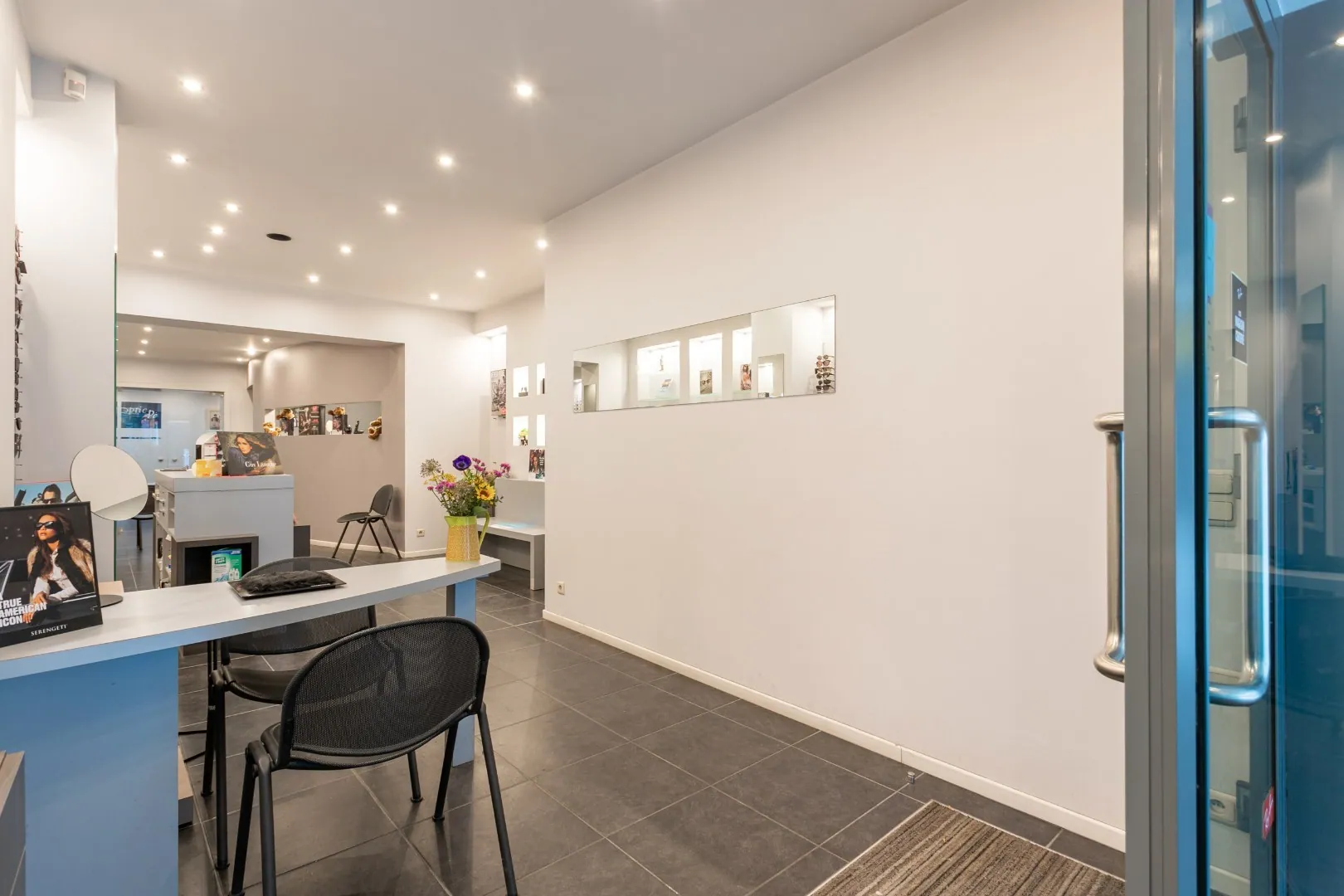 Het gelijkvloers niveau is heden ingericht als optiekzaak en biedt een functionele indeling: een winkelruimte, een technische ruimte en een bureau-ruimte met ingebouwde kasten.
