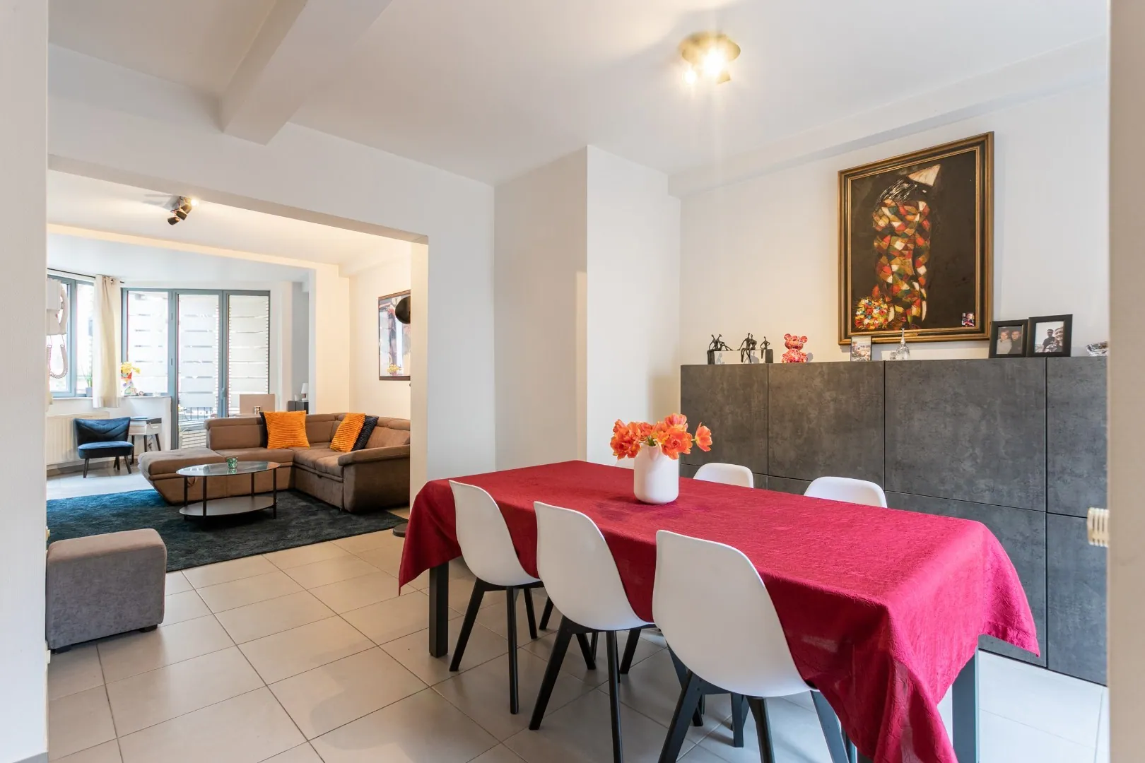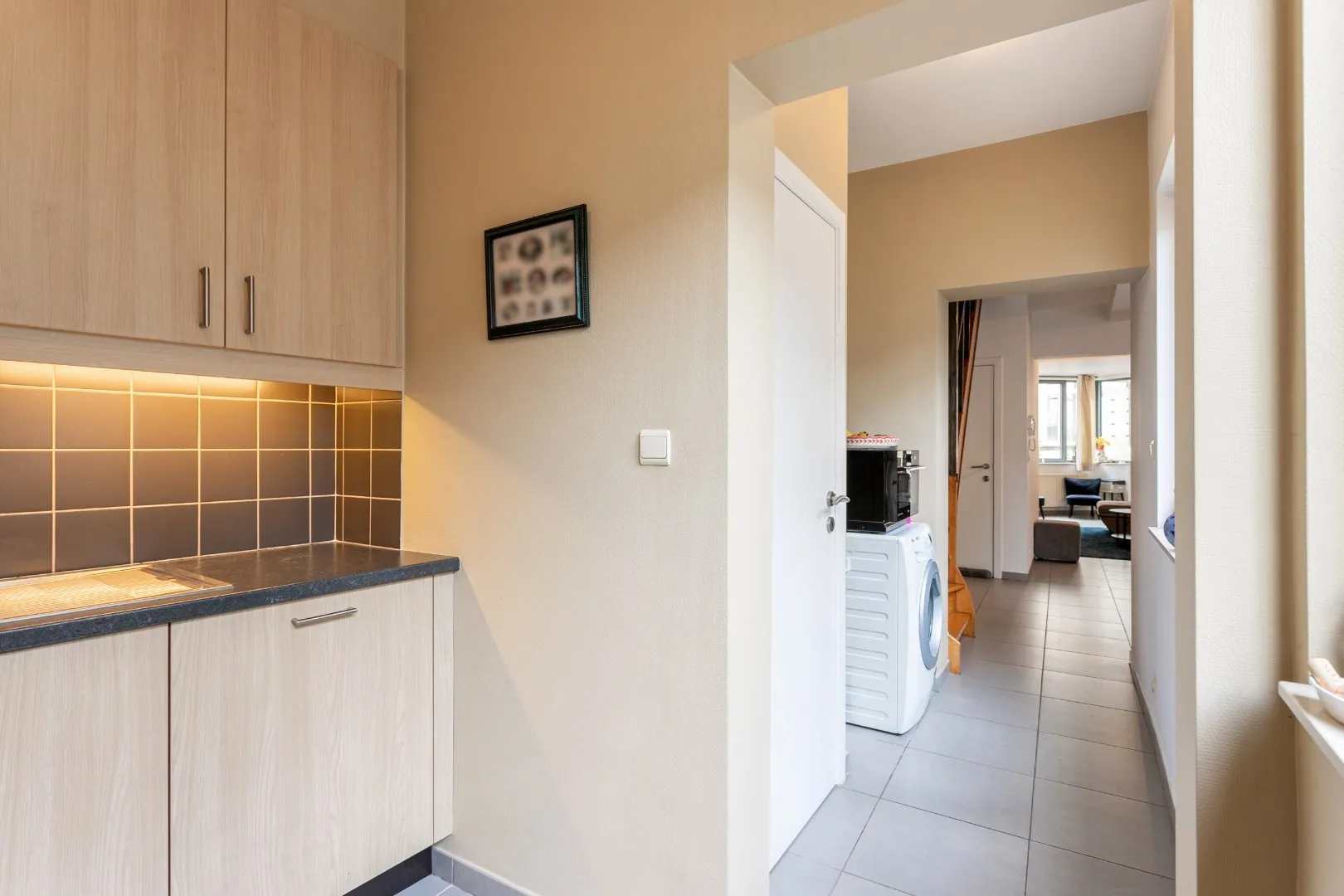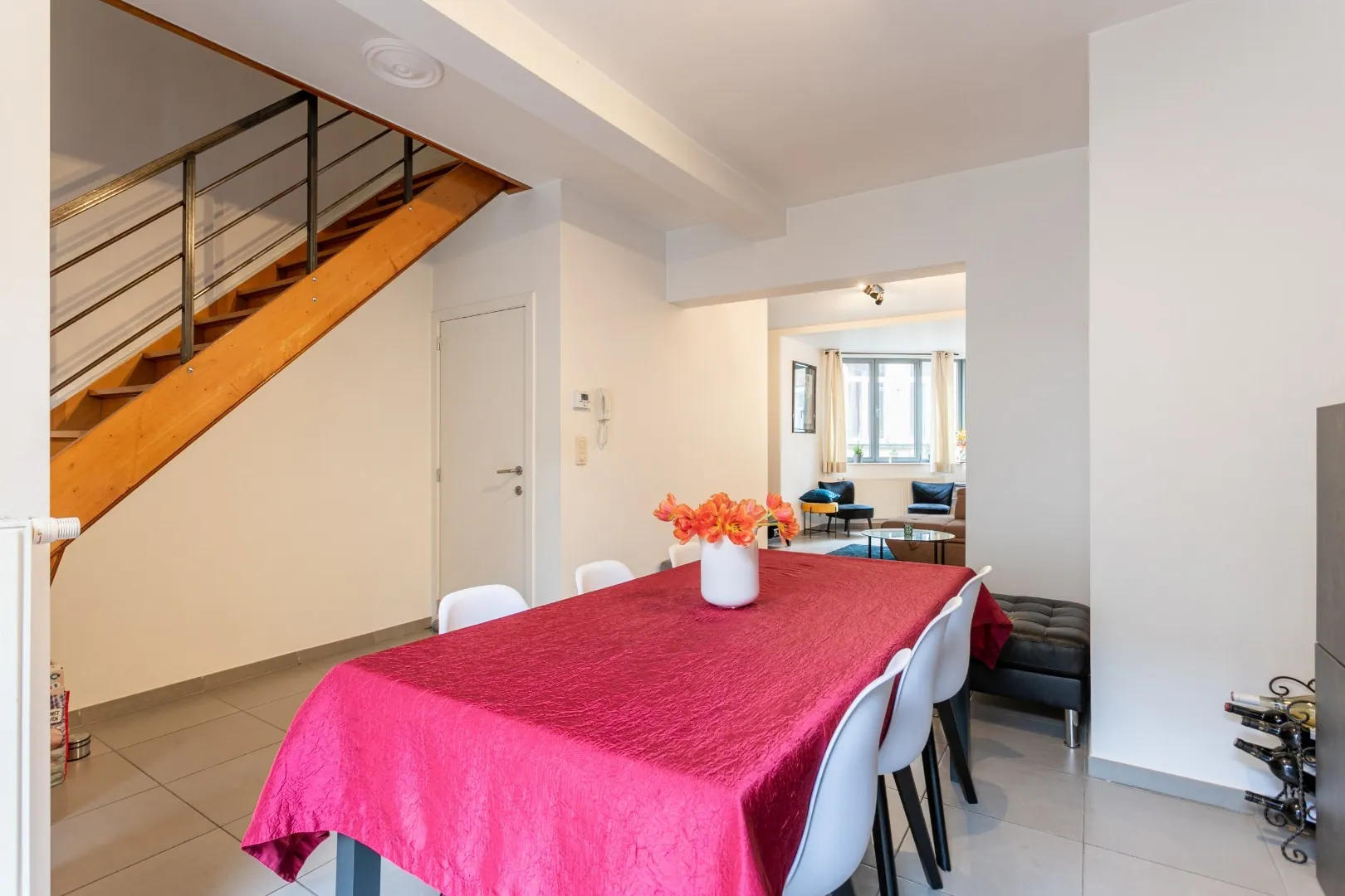 Via een aparte ingang, heeft u toegang tot het duplex-appartement, bestaande uit een lichtrijke leefruimte met toegang tot het balkon. Via de eetplaats wandelen we door naar de wasplaats, het gastentoilet en de keuken.