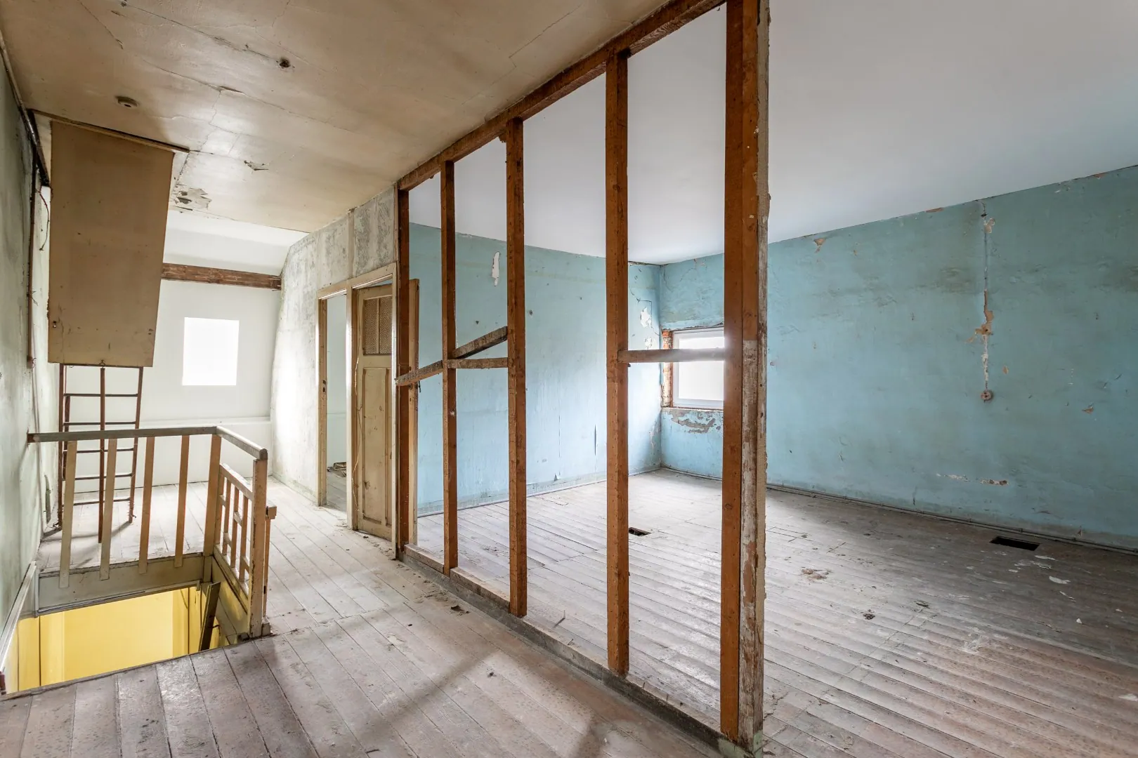 Het te renoveren duplex-appartement bestaat uit een ruime inkomhal, een lichtrijke leefruimte, een te installeren keuken, een badkamer (met douchecel, toilet, en lavabo) en is voldoende ruimte voor het creeëren van 2 tot 3 slaapkamers. De zolder is toegankelijk via een uitklapbare valtrap en biedt extra stockageruimte.