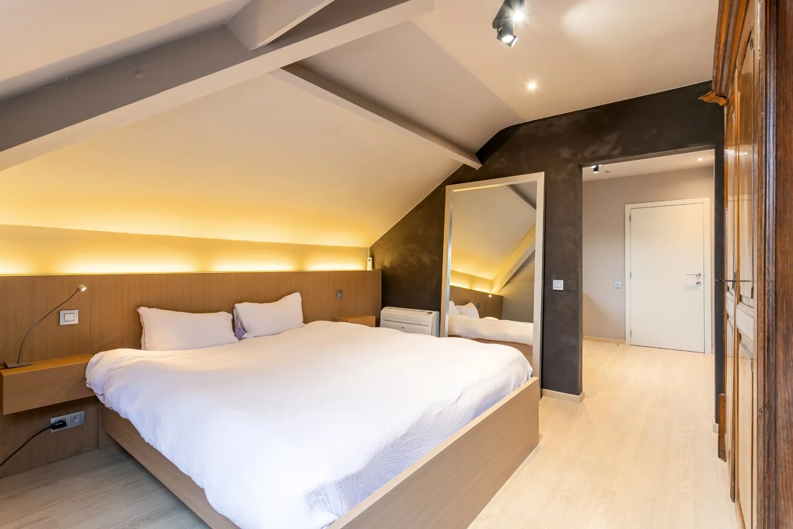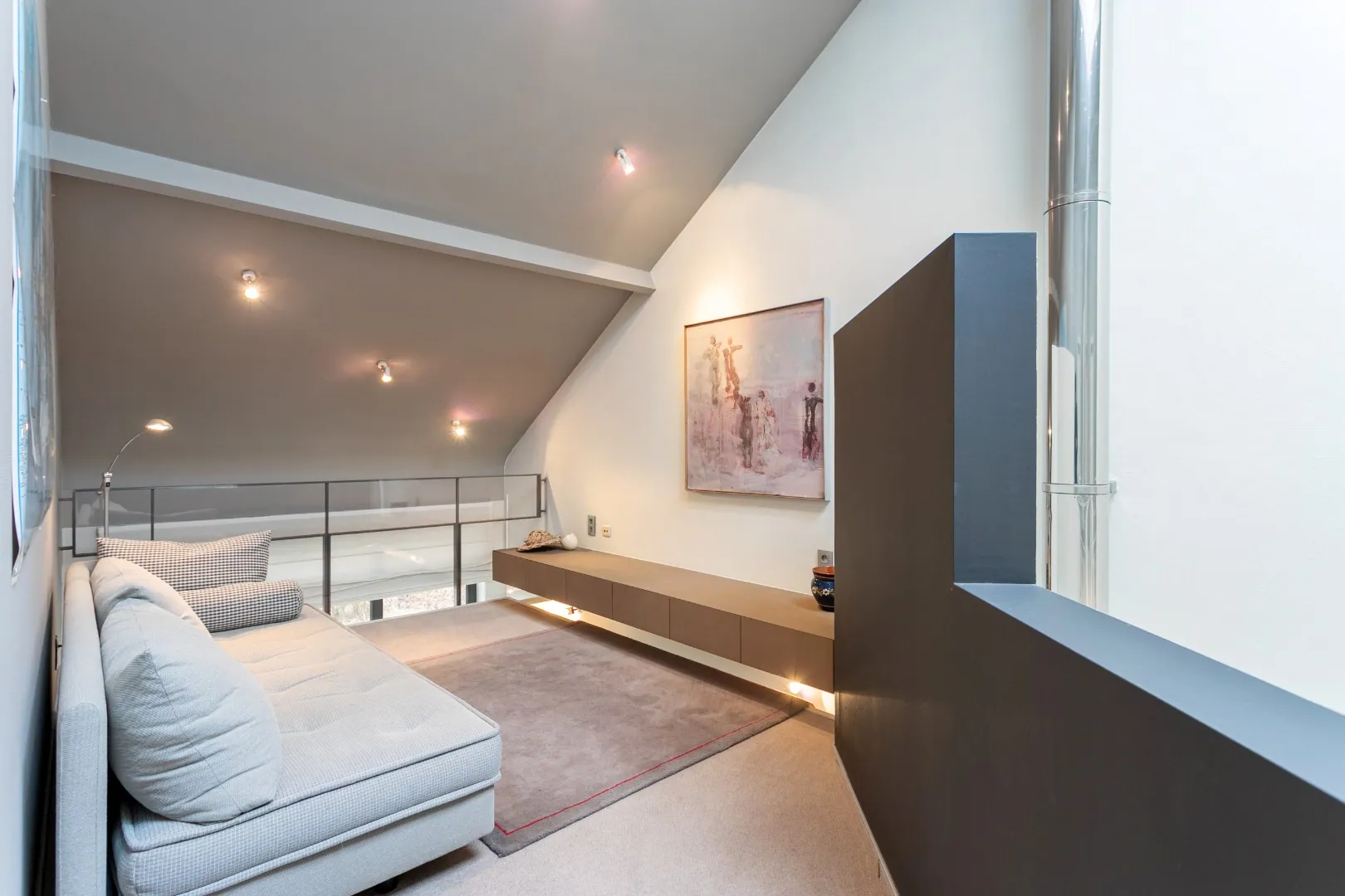 Via de trap bereiken we de verdieping, waar zich vier volwaardige slaapkamers, een sauna en een badkamer bevinden, uitgerust met een ligbad, douche en dubbele lavabo. De masterbedroom beschikt over een ensuite dressing. De vide doet dienst als tweede salon en is ideaal als logeer- of ontspanningsruimte. Ook op deze verdieping is er een apart toilet aanwezig.