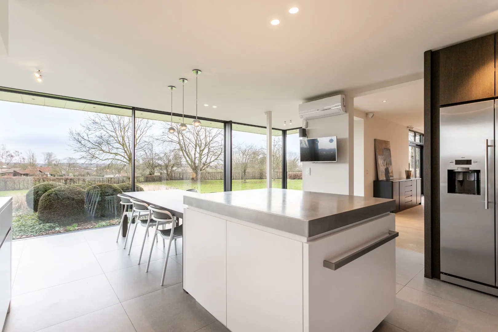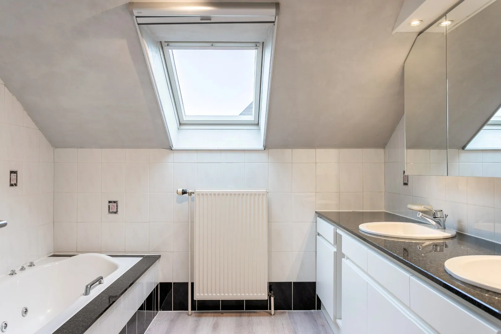 Verder biedt het gelijkvloers toegang tot de dubbele garage, die beschikt over ruime opbergmogelijkheden.