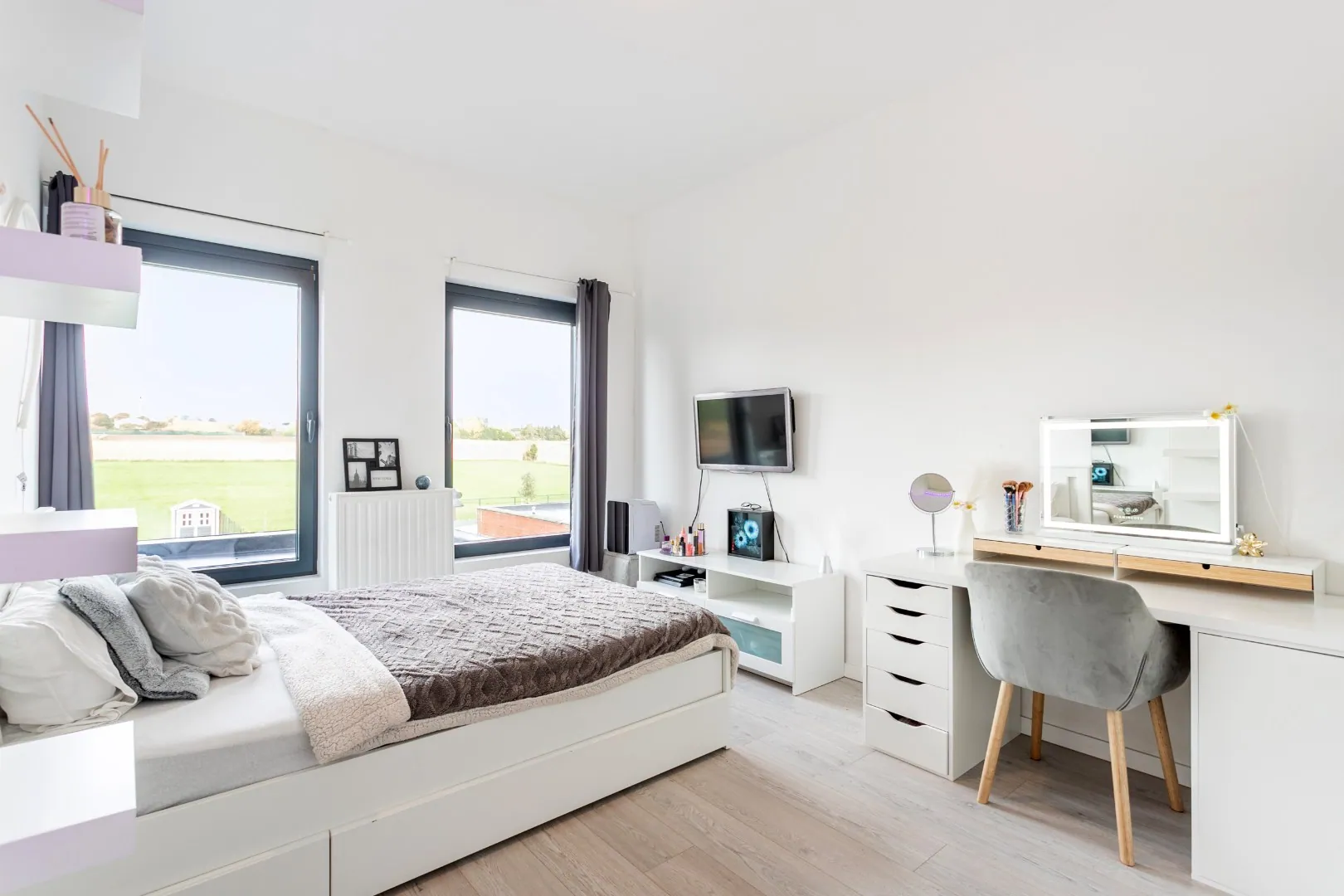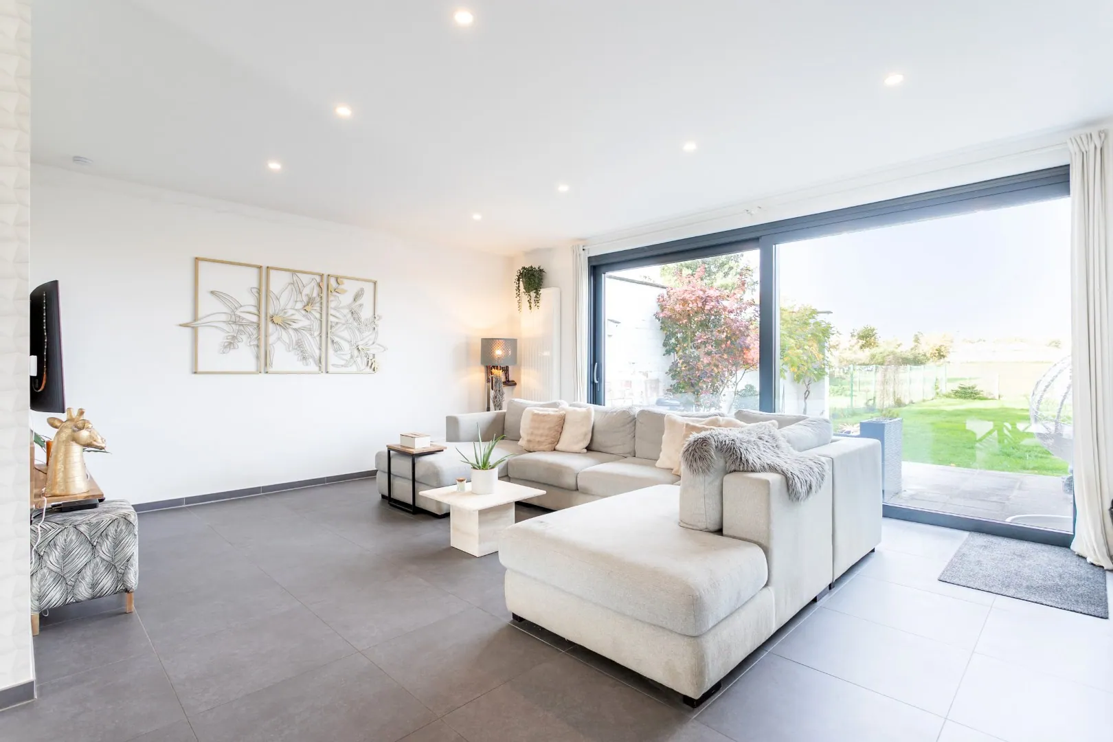 Een groot schuifraam biedt toegang tot het terras en de aangename tuin, met open zicht op de achtergelegen velden.