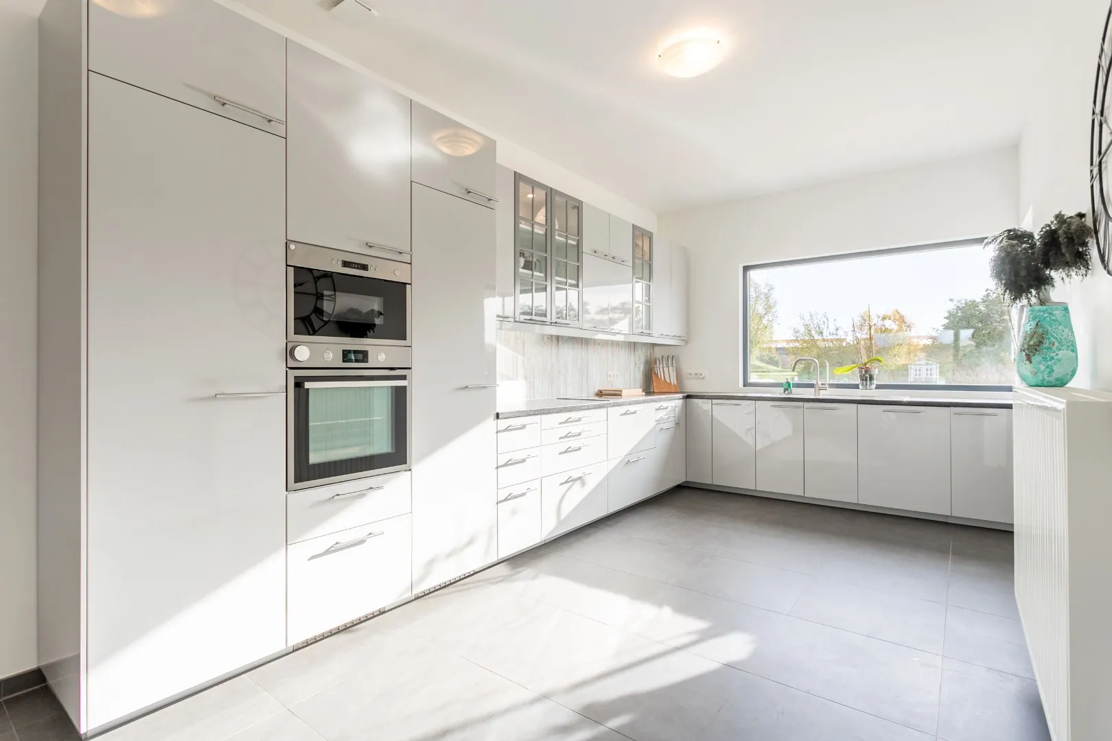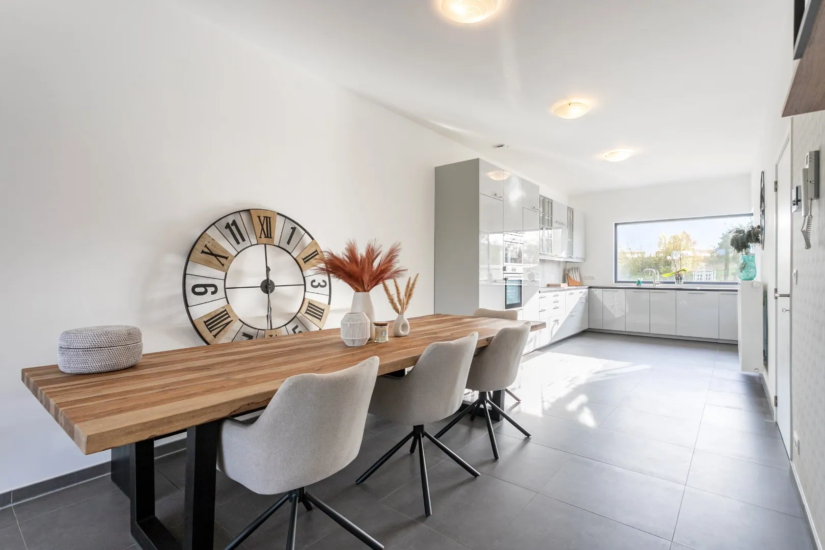 Vervolgens komen we terecht in een ruime leefruimte met veel lichtinval en een open keuken met ingebouwde keukentoestellen.