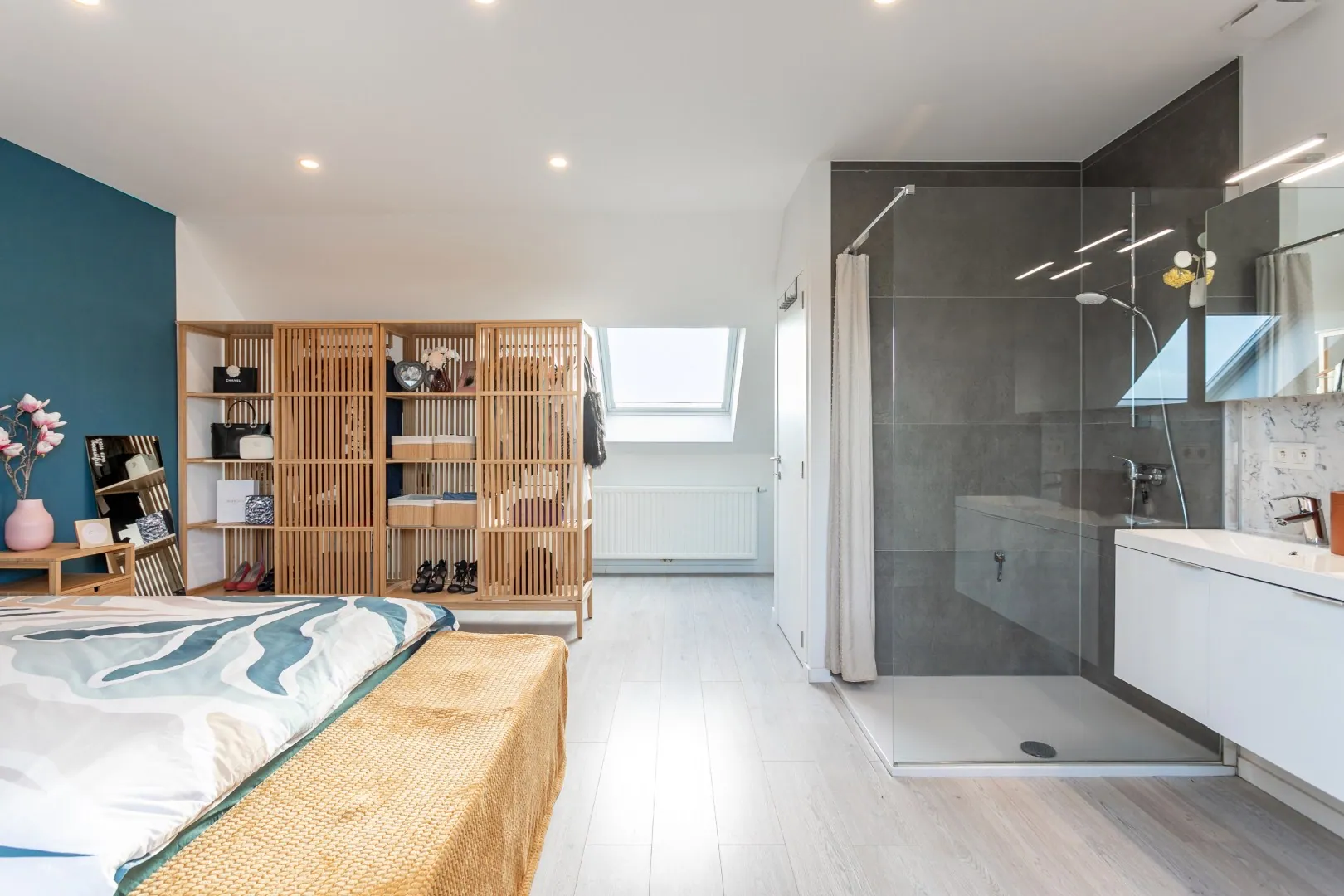 De tweede verdieping werd ingericht als masterbedroom met inloopdouche en lavabo. Er is voldoende ruimte aanwezig voor het creëren van een dressing.