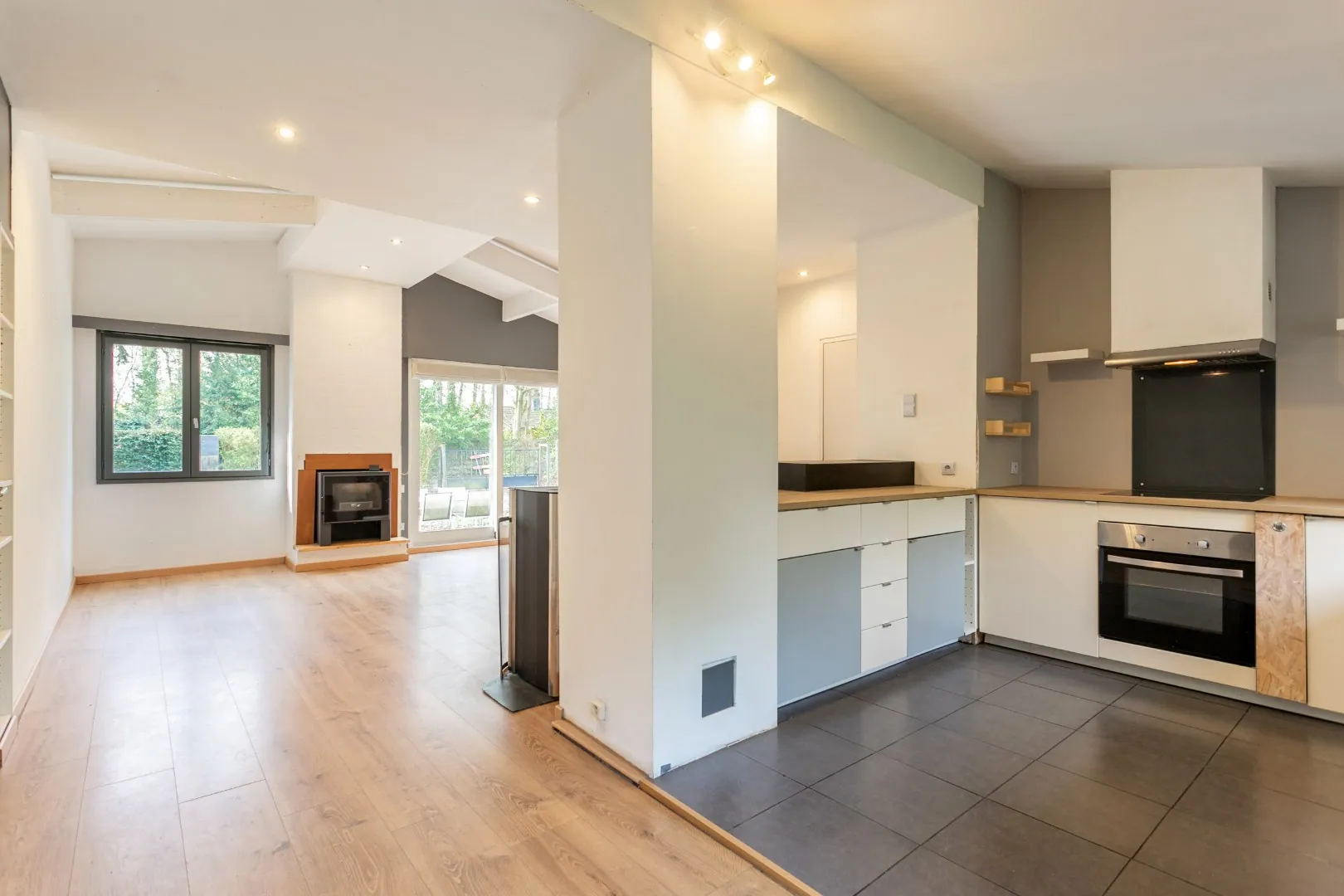 Bij het binnenkomen betreedt u de inkomhal met apart toilet, die toegang geeft tot de aangename leefruimte van 27 m². Deze is voorzien van een hout- en pellethaard en geniet van veel natuurlijk licht. Aansluitend bevindt zich de ruime keuken van 16 m² met een praktische bijkeuken of berging.