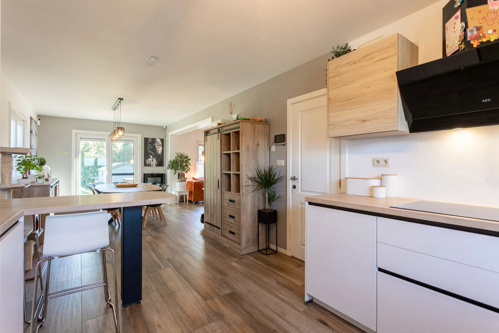 Op het gelijkvloers wordt u verwelkomd in een inkomhal met aparte wc, dressing en praktische wasplaats. Deze hal leidt naar een ruime en lichtrijke leefruimte, waar grote raampartijen zorgen voor een aangename sfeer en overvloed aan natuurlijk licht. Hier is er voldoende plaats voor zowel een eet- als zithoek. Aansluitend bevindt zich de nieuwe, volledig uitgeruste keuken met koelkast, diepvriezer, vaatwasser, oven, kookplaat en dampkap.
