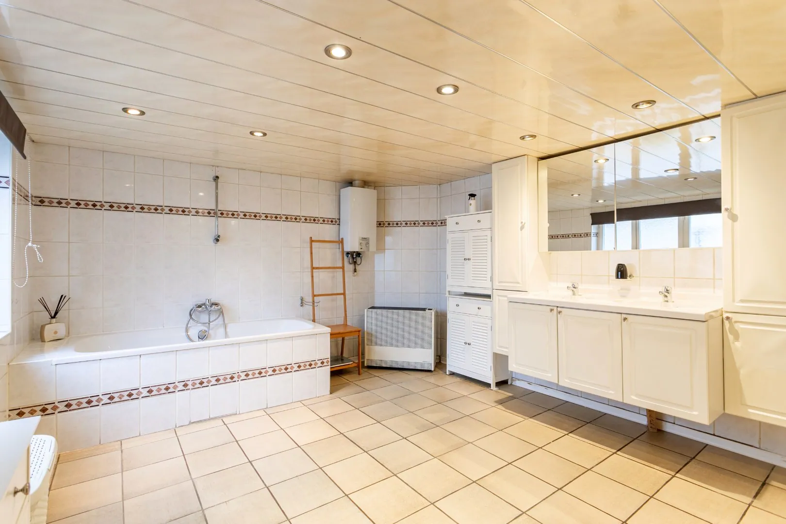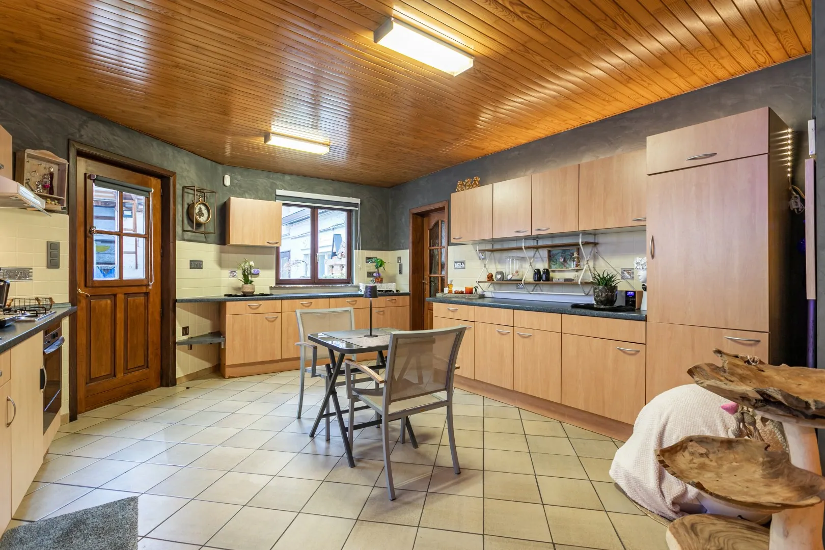 We betreden de woning via de uitgeruste keuken met toegang tot de binnenplaats aangrenzend aan de eetkamer. Verder vinden we op het gelijkvloers de ruime, lichtrijke woonkamer en de badkamer uitgerust met dubbele lavabo, bad, toilet en aansluitingen voor machines.