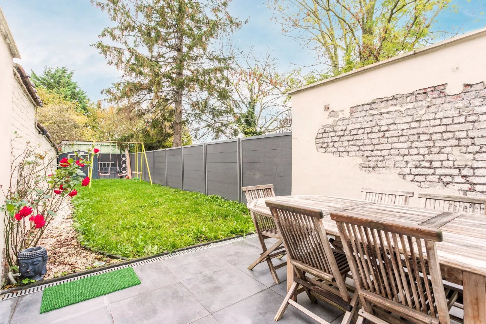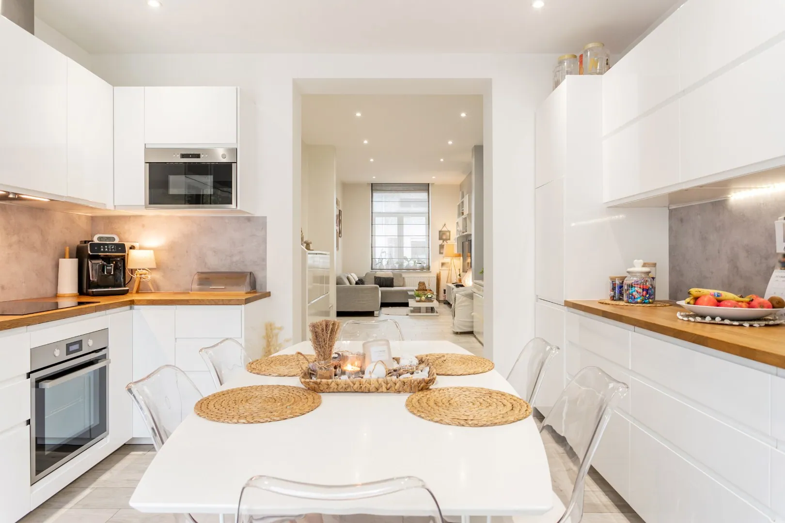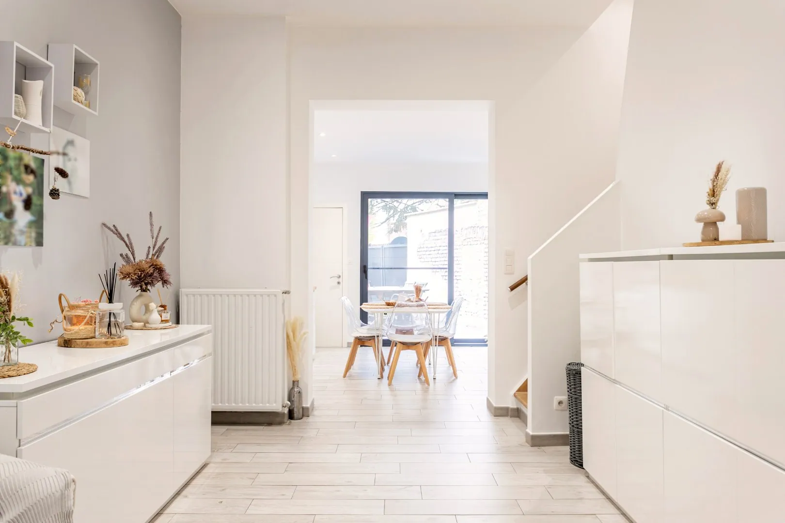 Bij het binnenkomen via de inkomhal betreden we de gezellige woonkamer, waar plaats is voor zowel een salon als een bureauruimte. Aansluitend bevindt zich de lichtrijke leefruimte met eetplaats, die – net als de volledig vernieuwde en geïnstalleerde keuken – toegang biedt tot een terras met aansluitend de tuin.