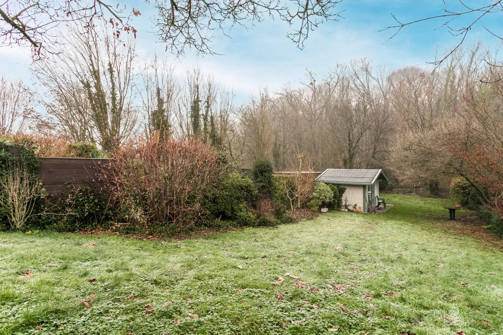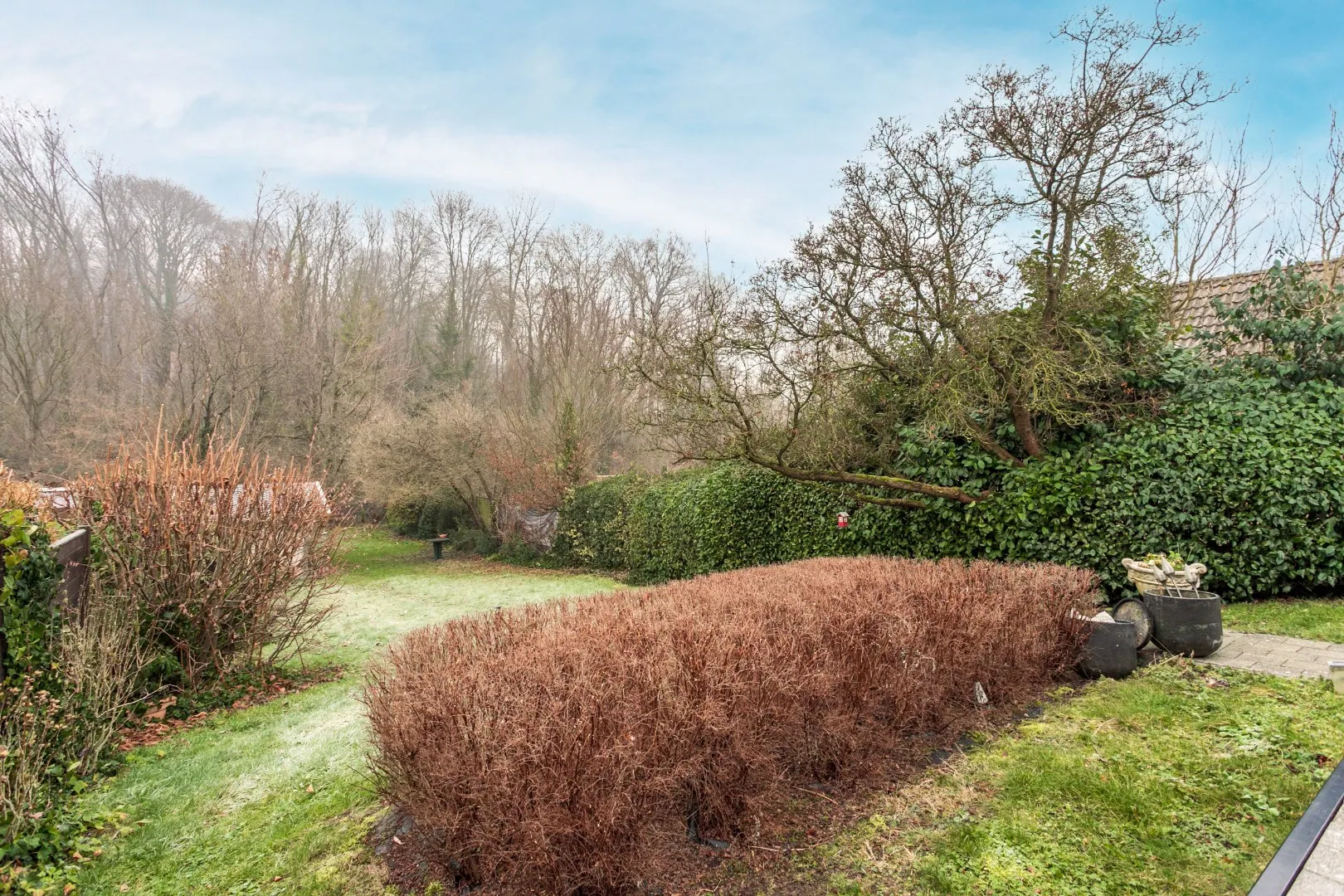 De woning heeft een ruime tuin met een aangelegd terras, waar het aangenaam vertoeven is in alle rust door het achterliggende Kluisbos.
