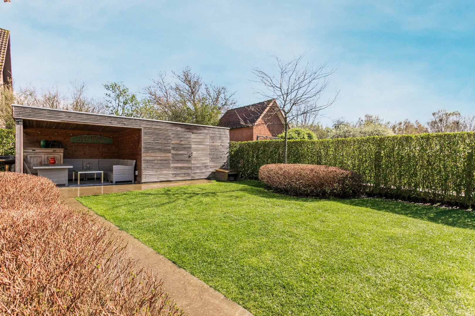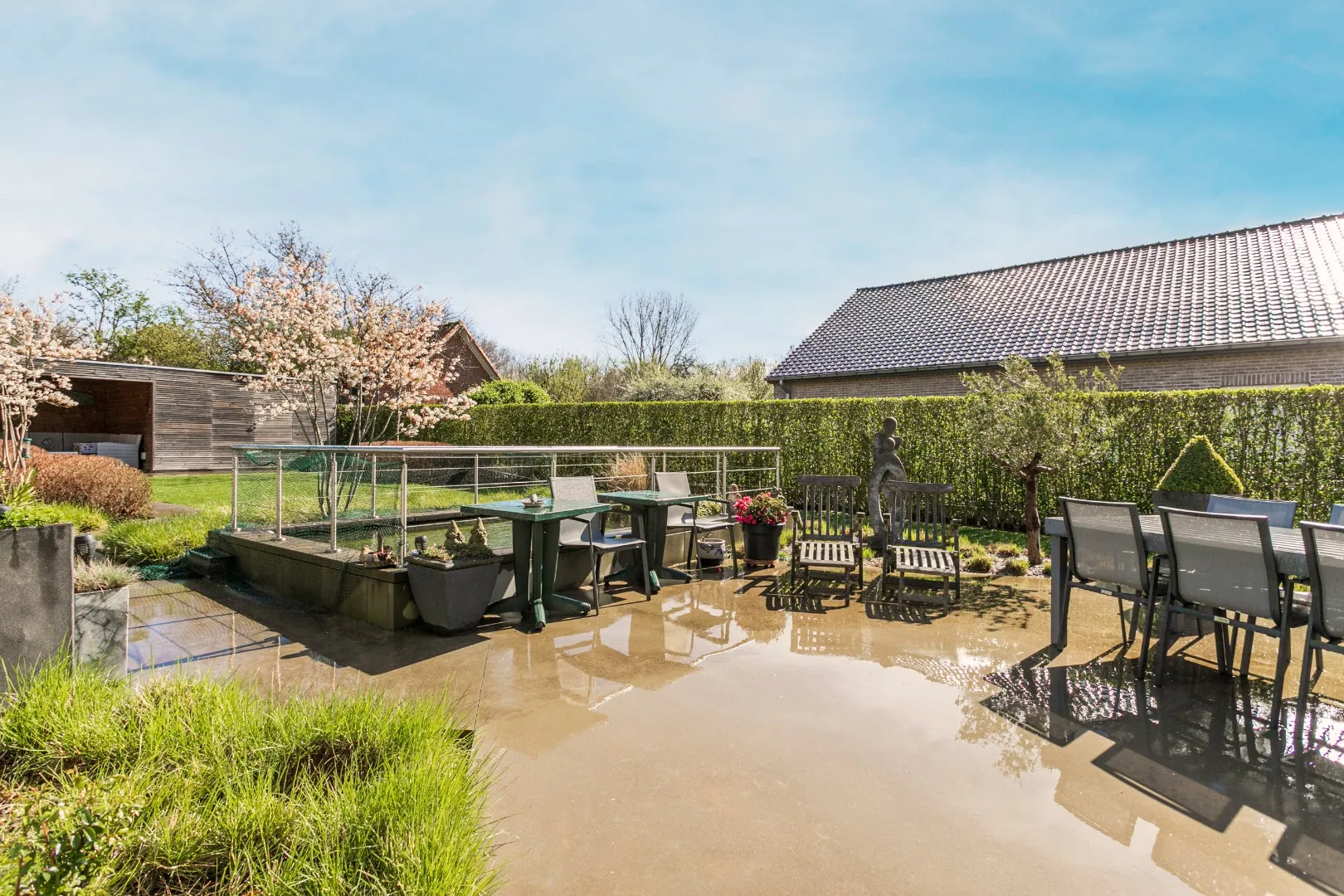 Naast een vijver, beschikt de tuin eveneens over een praktische tuinberging met overdekt terras.