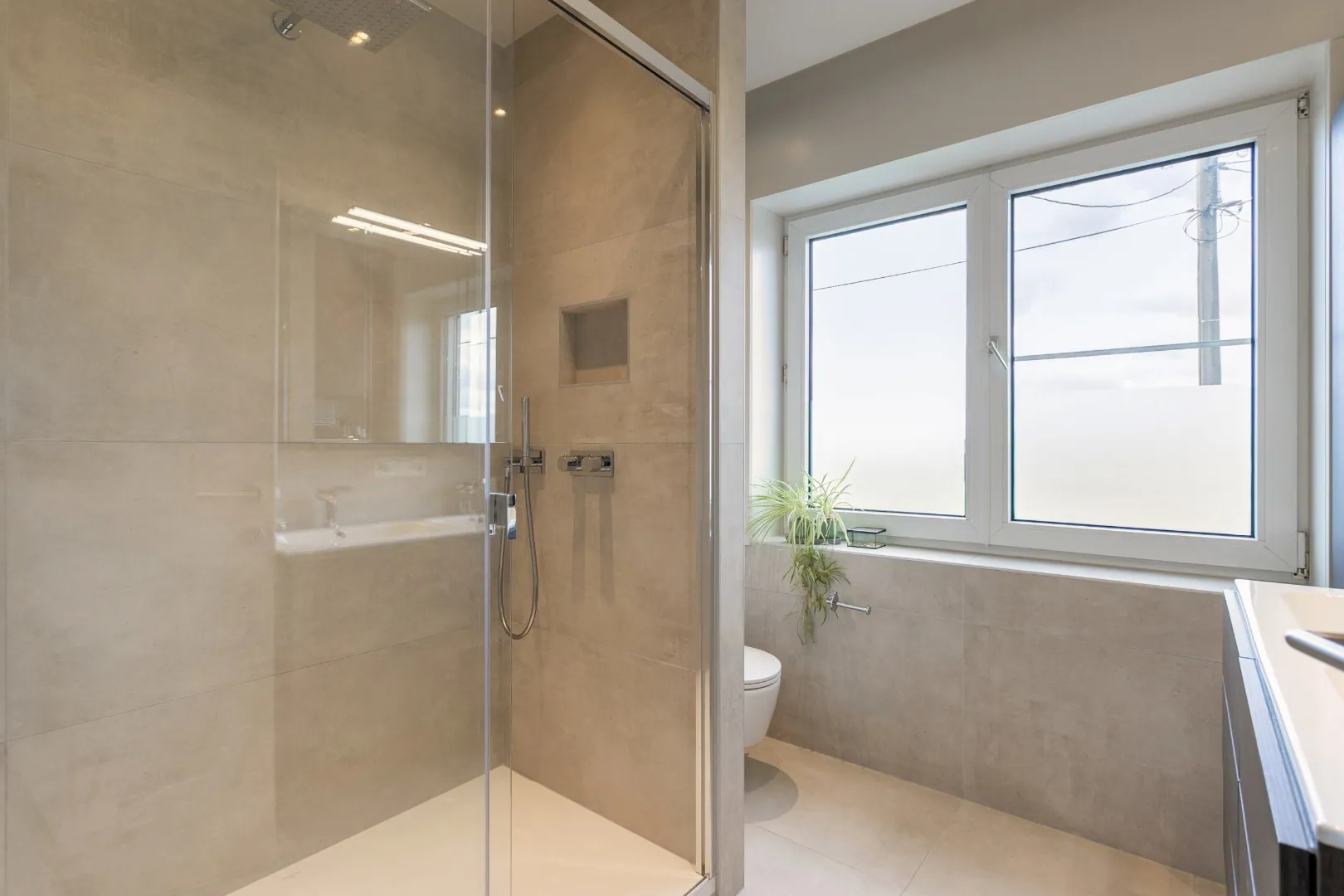 De naastgelegen ruime garage is rechtstreeks toegankelijk vanuit de woning, beschikt over een douchecel en biedt toegang tot de tuin.