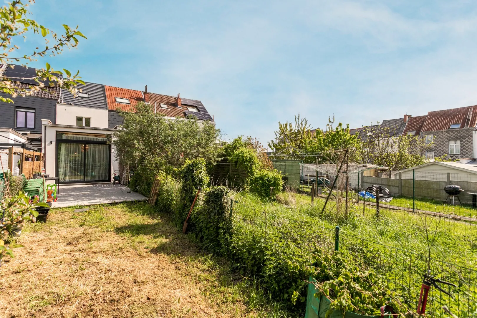 We betreden de woning via de inkomhal, waar zich een apart toilet bevindt. Vanuit de hal lopen we door naar de keuken, die aansluit op de open en lichtrijke leefruimte. Deze leefruimte is voorzien van een groot schuifraam dat directe toegang biedt tot de tuin, ideaal om te genieten van het buitenleven.