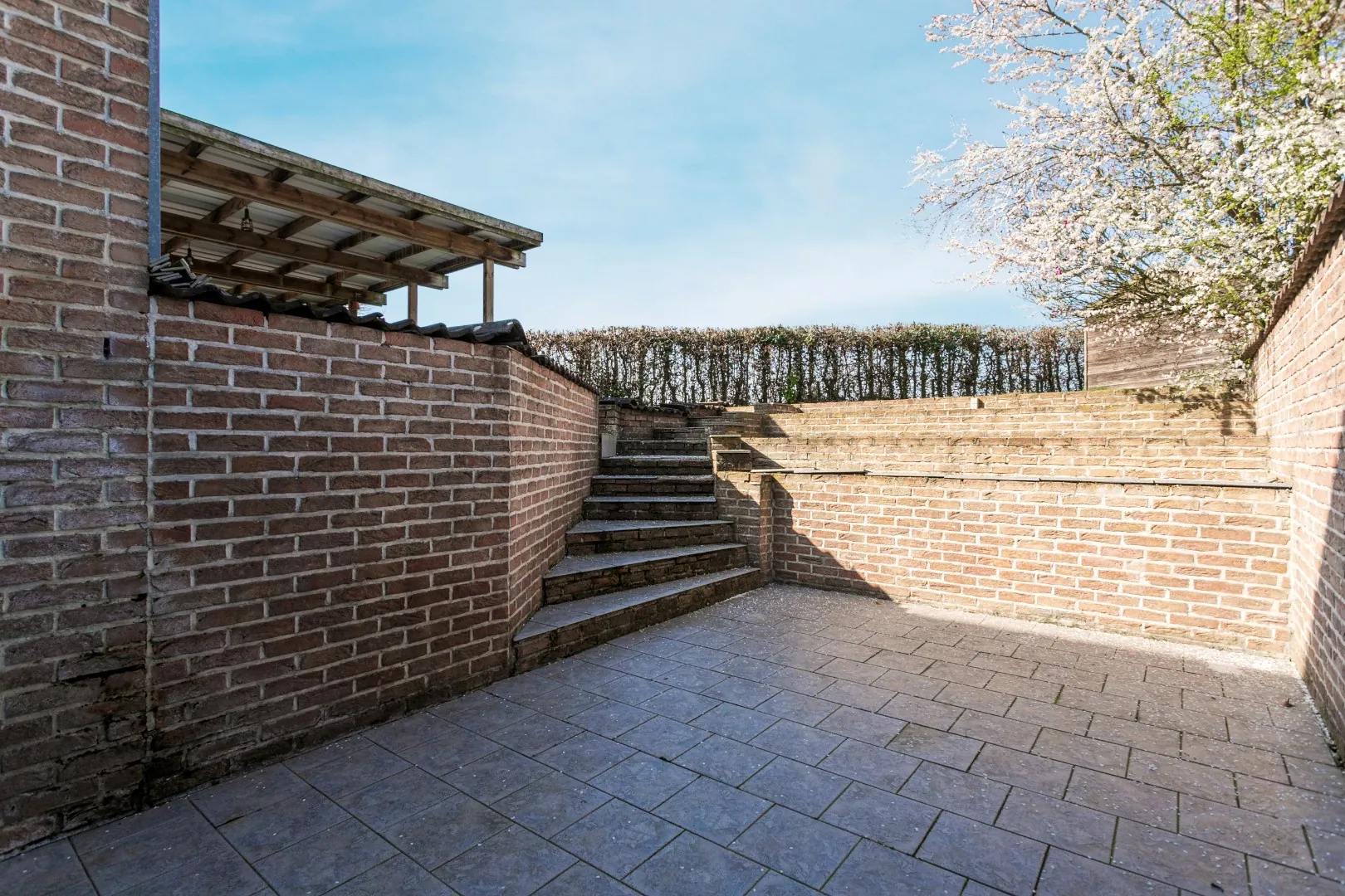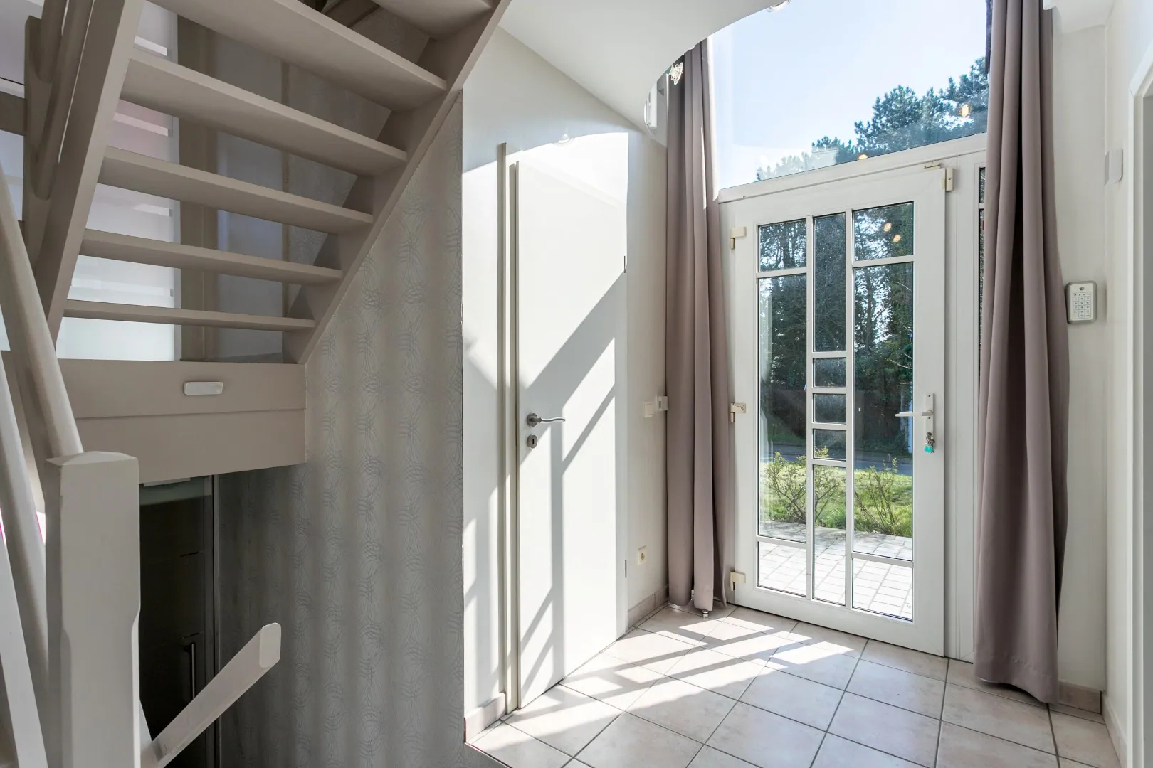 Verder beschikt de woning over een bijzonder praktische indeling. Via de inkomhal is er een trap naar een tussenverdiep, waar zich een aparte slaapkamer en een badkamer bevinden, met toegang tot een lager gelegen terras.