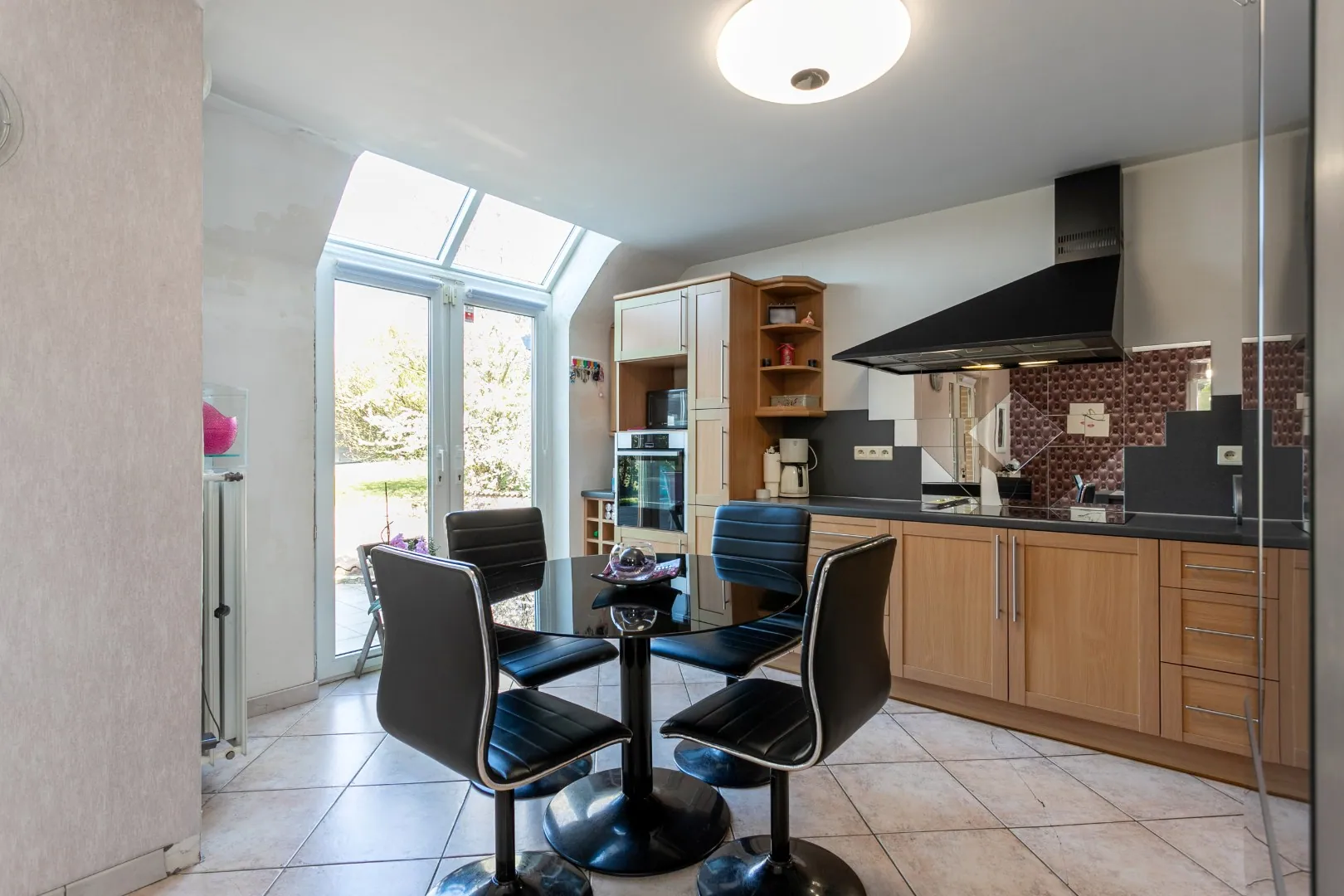 Bij het betreden van de woning komen we in de inkomhal met apart gastentoilet. Van hieruit hebben we toegang tot de lichtrijke en ruime leefruimte, die naadloos overgaat in de recent gerenoveerde open keuken. Deze is volledig uitgerust en biedt directe toegang tot de fraai aangelegde tuin, waar het heerlijk vertoeven is.